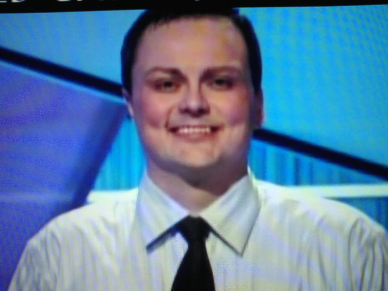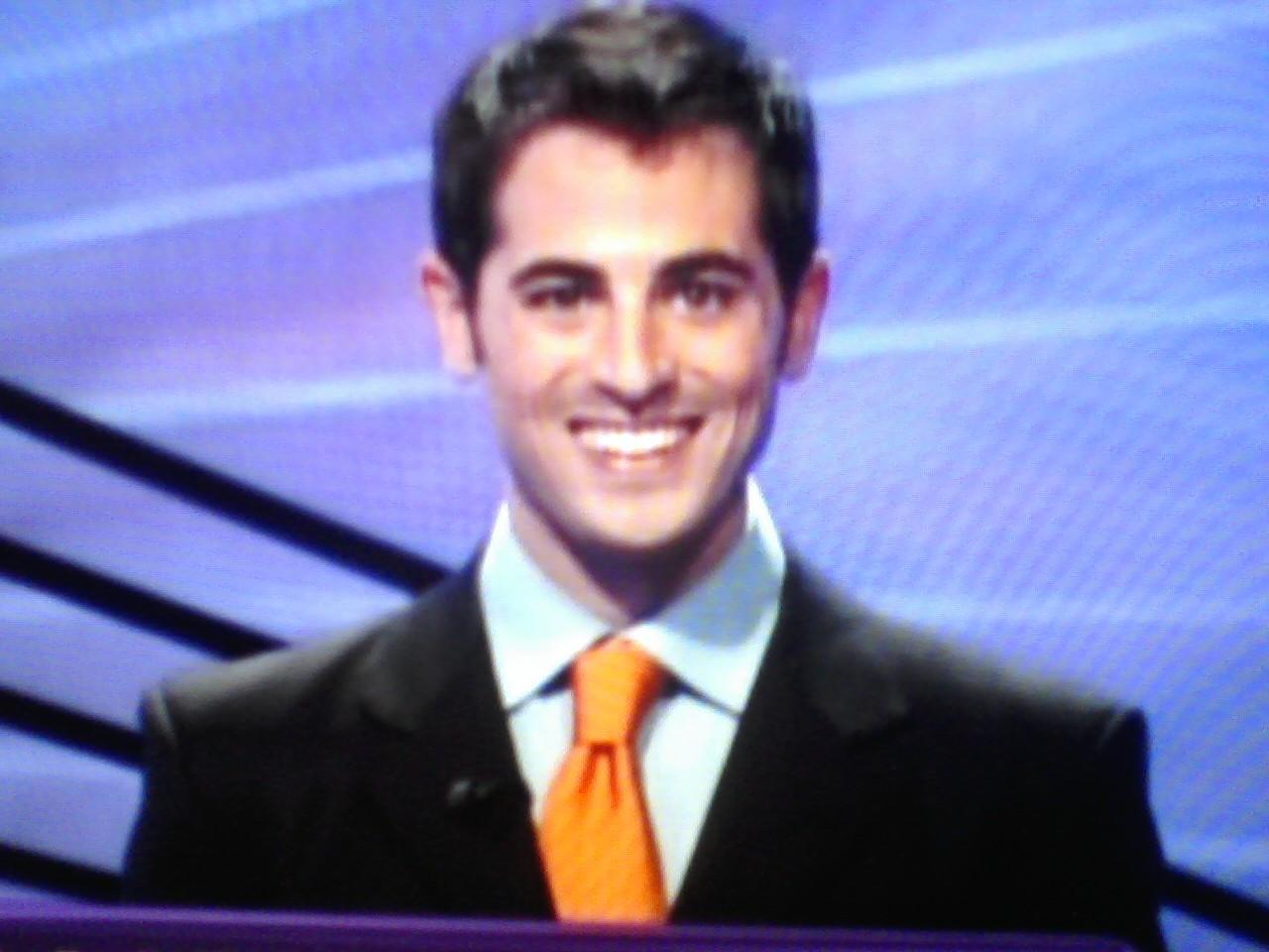 The final scores going into Final Jeopardy were: Anthony 11000, John 11500, Matt 14000. The category was The Presidency. Here is the clue, which stumped all of us: “From the same state, they’re the two presidents whose occupations are listed by World Book as ‘planter.'”* Anthony lost only 1000. John lost 2501, and Matt lost a whopping 9001. Anthony is your champion again, although today I feel like he kind of stole it from two stronger players! I love Anthony’s celebratory fist-pump, though! We’ll see him next week. His Coryat score was 12400, John’s was 11200, and Matt’s was 13600.