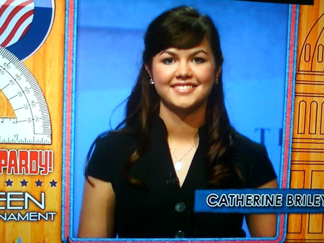 The contestant interviews were similar to yesterday’s, when they talked about who inspired them. Today they could talk about whatever they wanted, but they all just thanked people. Elyse and Catherine squeezed in their high school names (Elkhorn South and Sacred Heart, respectively). Rose (who by the way could consider a career in modeling) mentioned her church, Parklane Portland Christian. Did you guys notice Mr. Trebek reading the contestant lecterns when he said their names?