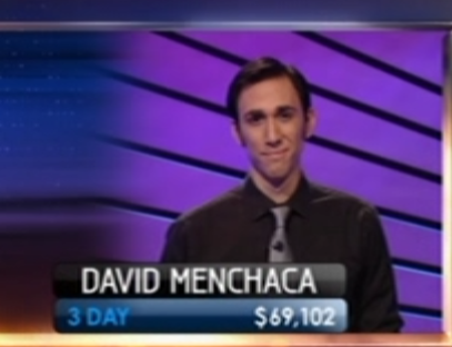 Andy back again, and today we get to watch David Menchaca try to make his was up the ToC standings; as I told Jeanie yesterday, with David having passed a few of her favourites on those standings, that we should be hoping for a Ken Jennings-like run that takes out more than a few people that might otherwise make it!