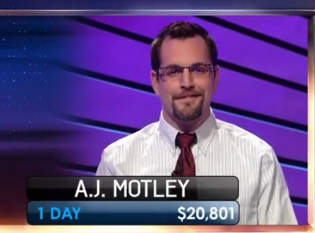 Shortly after the interviews, it was AJ that got to the Daily Double, under NOT SO GAY PAREE $800. The scores: