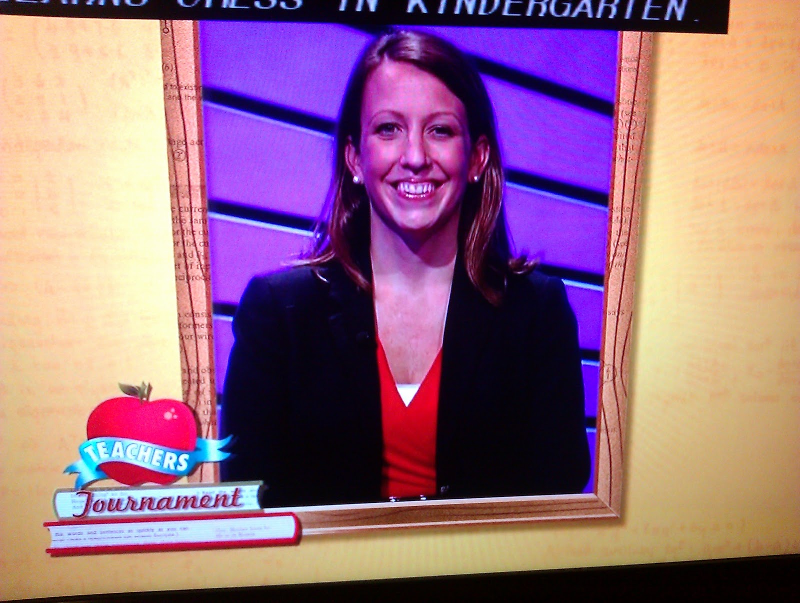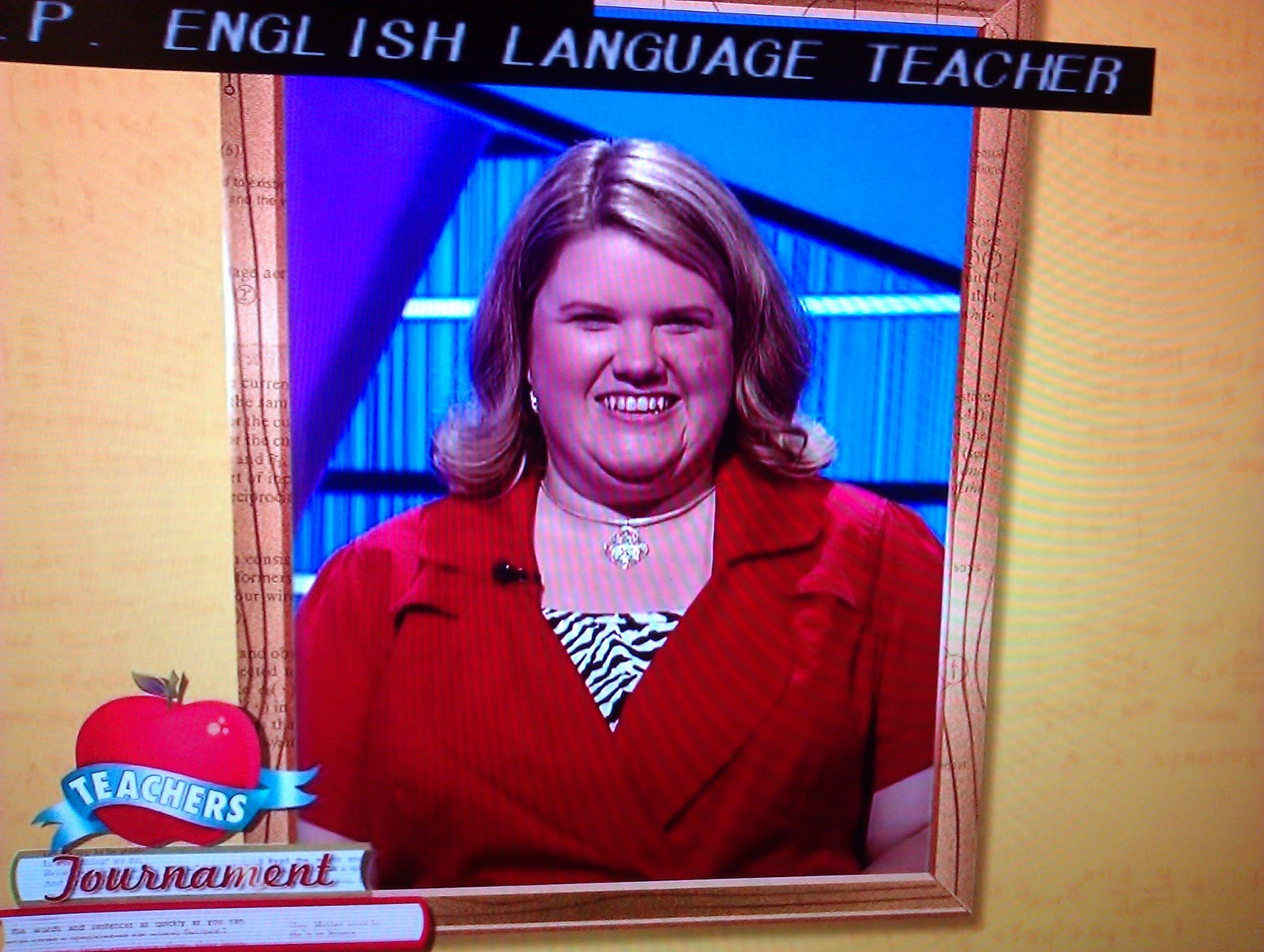 At the first break, Kate had gotten 7 right and had 3600. Drew had gotten one right and 2 wrong and was in the hole 1000. Whitney had gotten 5 right and one wrong and had 2200. Drew came alive though, after the break, getting 6 right. Two of those were rebounds from Kate’s incorrect responses. Kate had also gotten 2 right and had 3400. Whitney too had gotten 2 right and had 3000. Drew had 2600, and he wagered 800 on this clue in 9-Letter Words: “A standard of measurement, especially one 3 feet long.” He and I got it right! There were 3 clues left in the round. Whitney got 2 of those and Kate got one. They had 4800 and – oh! – 4400 respectively.