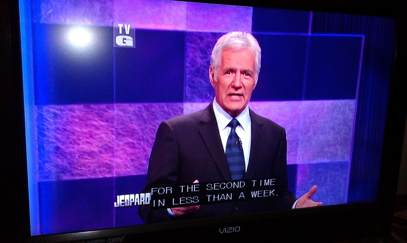 Poor Scott lost his 2K when he negged on a triple-stumper, this with 5 clues left. Luckily he got one of those right. Kristin and Katie got 2 right, and Katie also got one wrong. So Kristin ended the round with 22000, Scott 1200, and Katie 13800. Mr. Trebek said Scott was “still alive.” I said that about myself at the end of my Double Jeopardy round, and Mr. Trebek repeated it.