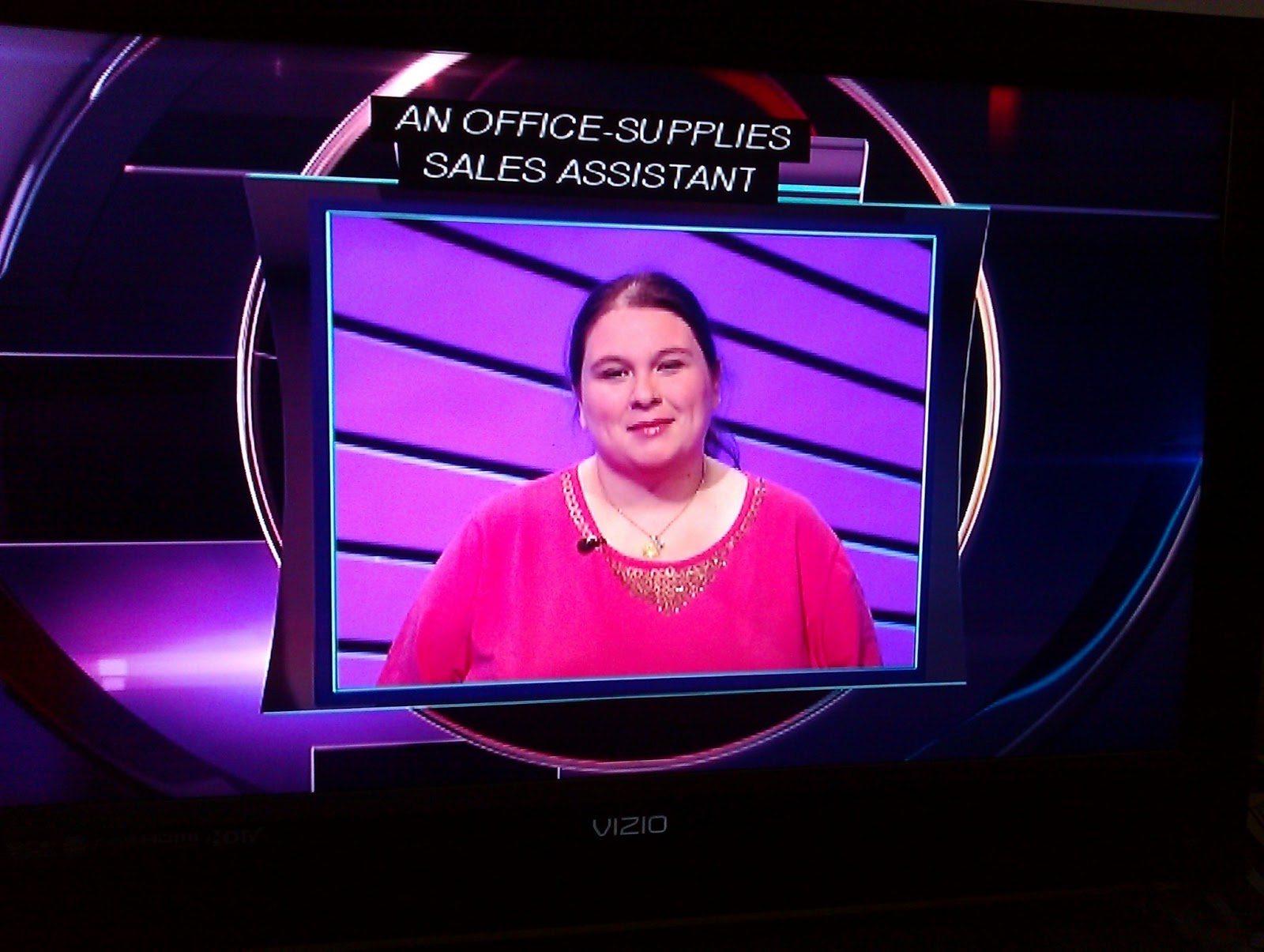 I hadn’t noticed Rebecca was in third place til Mr. Trebek said so after the break. Then I really noticed she was not successfully ringing in very often.