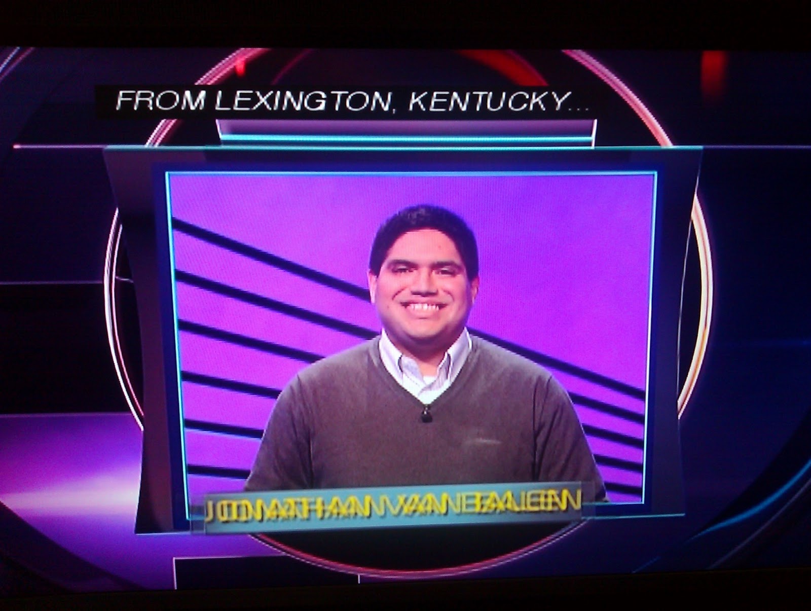 The Final Jeopardy category was Sporting Events. Mercifully, it was an easy clue for these contestants: “An old name for this Olympic sporting event is the quinquertium.” Kathy wrote “pentathalon,” and it was accepted. She added 398. Jonathan was right and added 5001 . Rachel was wrong and lost 5401. Jonathan will be back tomorrow. I’m actually kinda looking forward to seeing how he’ll do. And at least he doesn’t push his sleeves compulsively.