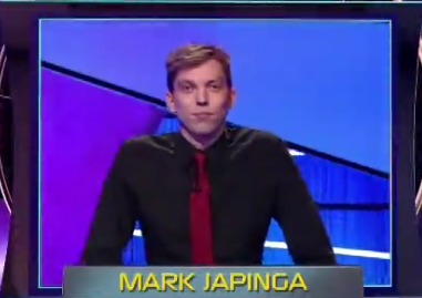 Following this, Ben started to struggle a bit! He took negs on clues like (“BAR”RAGE $1200) “Adjective for crude & uncivilized practices” and (19th CENTURY NOVEL QUOTES $1200) “”Miss Havisham was alone. ‘Well?’ said she, fixing her eyes upon me. ‘I hope you want nothing? You’ll get nothing”‘”. Both were rebounded by Mark!