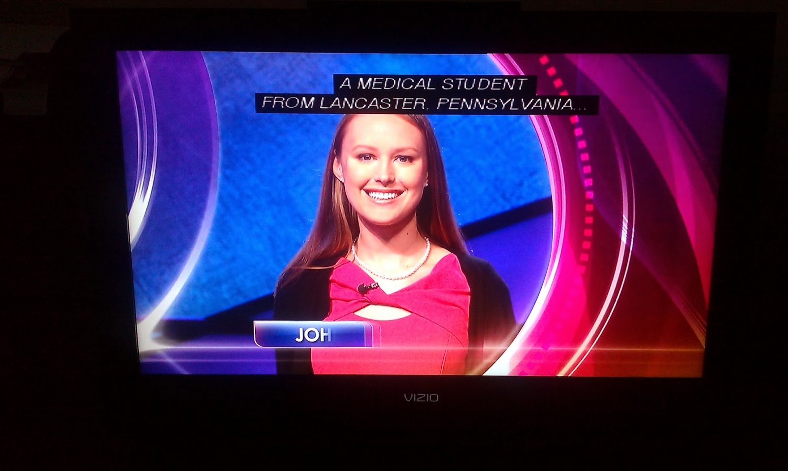 Mr. Trebek referred to Johnna as “Johanna” at the top of the show, but I wouldn’t have noticed it if Mr. Trebek hadn’t said later, “It’s ‘Johnna.’ I keep…I’m slipping up.” I’m sure she’s used to it! Johnna’s a medical student, BTW, so I wonder if she was as happy as I was to see TV Physician and Heal Thyself.