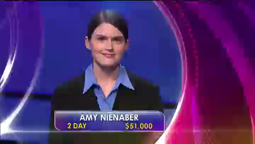The game came down to the final $800 clue, and any of the three people could have had the lead! Amy got it to pull into the lead! Scores going into Final: