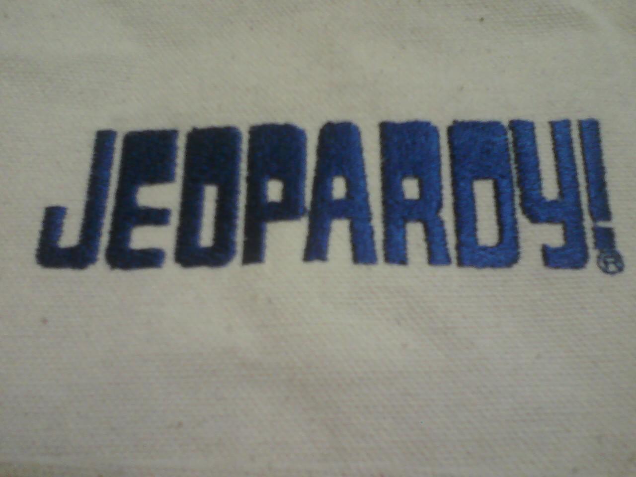 That’s right, dear readers, The Jeopardy! Fan is holding its first contest! Up for grabs: the beautiful Jeopardy! bag pictured below. (A close-up of the logo is on the right.)