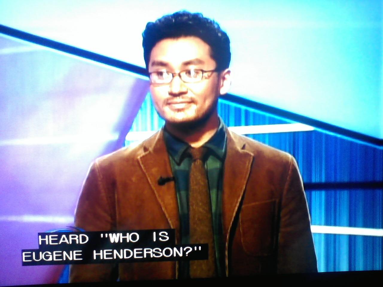 Yet another snafu during today’s episode: For some reason the image on the screen was stuck on that of a commercial that aired before the show started. At this point I don’t know the correct spellings of the contestants’ names (except for yesterday‘s champion, of course), and they don’t appear on j-archive.com yet, so we’ll just have to go with their first names. Isn’t it cool that Eugene’s name appears in his photo? But that was referring to a different guy, so I don’t know if that’s how this contestant spells his name. Eugene had been talking about a time that his name was the response to a clue on the show.