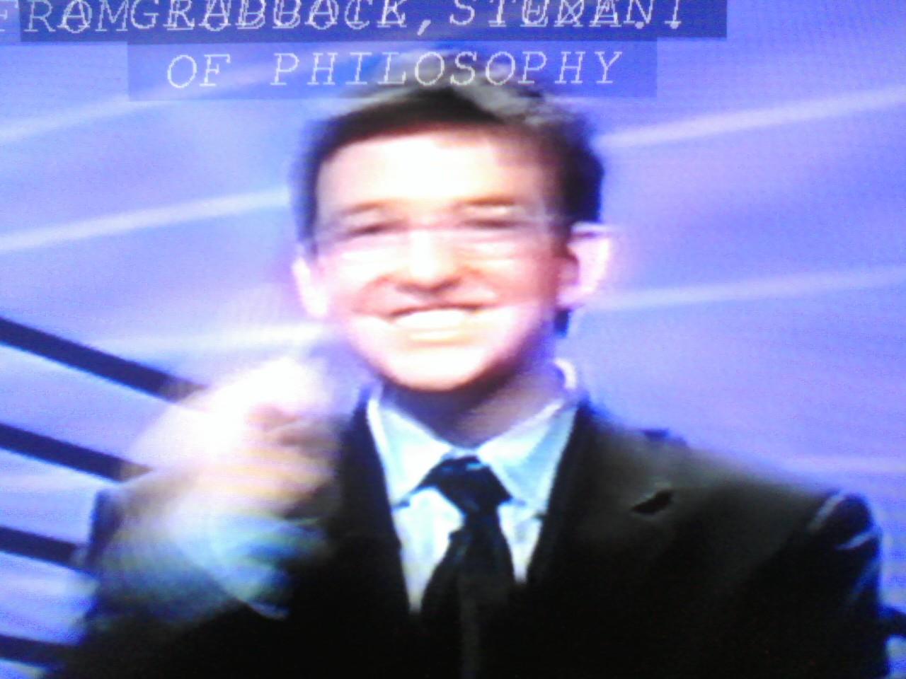Today’s episode was entertaining starting with the introduction of the contestants. The first contestant introduced, Mary Mitchell, was from Washington, D.C.! (You may know I just came from there for the unofficial Jeopardy! reunion that coincided with the National History Bee and Bowl.) Then, the next contestant, Jason Rhode, gave a dramatic and ecstatic salute to the camera, first pointing, then waving. I had to take two pictures of him because he was moving so much, and still neither are that good! I wish I had a picture of my dad imitating the move! Then the returning 4-day champ, Sara Heard, had quite the opposite demeanor, which induced my dad, whose birthday is tomorrow!, to say, “Smile, Sara.” Here they are: