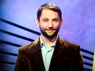 Evan found the Daily Double in the ballet category before the first break. Each contestant was off to a pretty good start. Evan had 1200, Dave had 600, and Emily had 1400. Mr. Trebek said Evan looked “altogether too serious.” What? If you’ve been watching you know that Evan often wears a goofy expression, and hasn’t looked serious! (See the photo above!) In fact I noticed that Emily looked quite serious. (See her photo above.) Evan wagered everything on this clue: “Prince Siegfried finds romance is for the birds (like Odette) in this 19th century ballet.” Evan got it right. At the first break, Evan had 4400, Dave had 1400, and Emily had 2000.