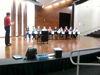 There still weren’t any signs at the right entrance (I myself had to ask where to find the Bee when I first got there), so I thought I’d wait and lead people to the right place when they walked in. I was standing there less than a minute when I heard applause in the auditorium. I took that as my own cue to get in there. 😉 David was addressing the crowd from the stage. He is a born emcee, and he seems to relish it. I witnessed it last year, too. I doubt anyone could honestly accuse him of being shy! In fact, if “people person” were in the dictionary, his image would be there.