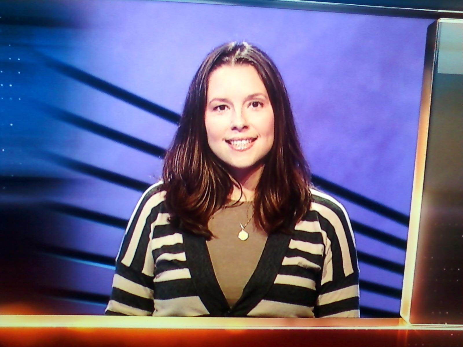 Mr. Trebek gave the less-than-a-minute warning then, with 7 clues left. There were 2 clues left at the end of the round. Ursula still led, with 6400 (4 right since the break)! Joel had 3400 (5 right), and Julie, who looks too young to be married 18 years!, had 2400 (1 neg and 1 right).