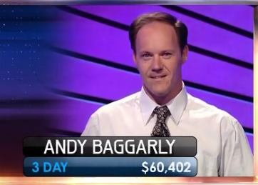 We got through over half of the clues before we saw the first Daily Double, under BIOGRAPHIES $1200, Andy had just retaken the lead before he got to it. The scores: