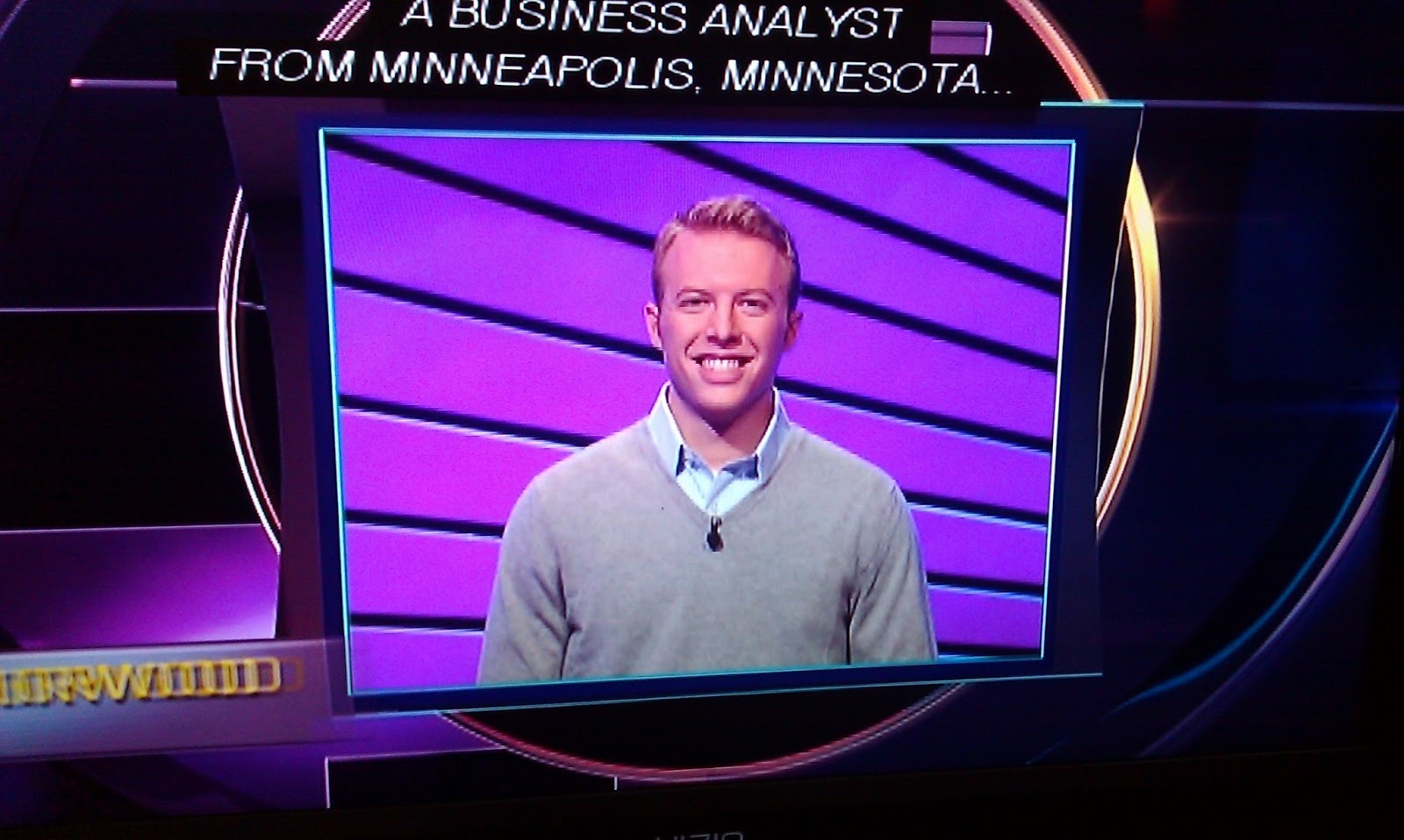 At the end of the Jeopardy round, Drew had 2400. He’d gotten 4 right since the break. Jennifer had 1800 after getting 2 right and 2 wrong. Lloyd had gotten 6 right since the first break and had 7800.