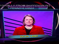 Mr. Trebek gave the minute-to-go warning with 7 clues left, and 3 were left covered. Maybe he spoke to the contestants too long? Otherwise the game was moving briskly! Scott got 5 right and one wrong since the break, and ended the round with 7000. Julia got one right and had 3000. Mike got 2 right and 2 wrong and had 4200.