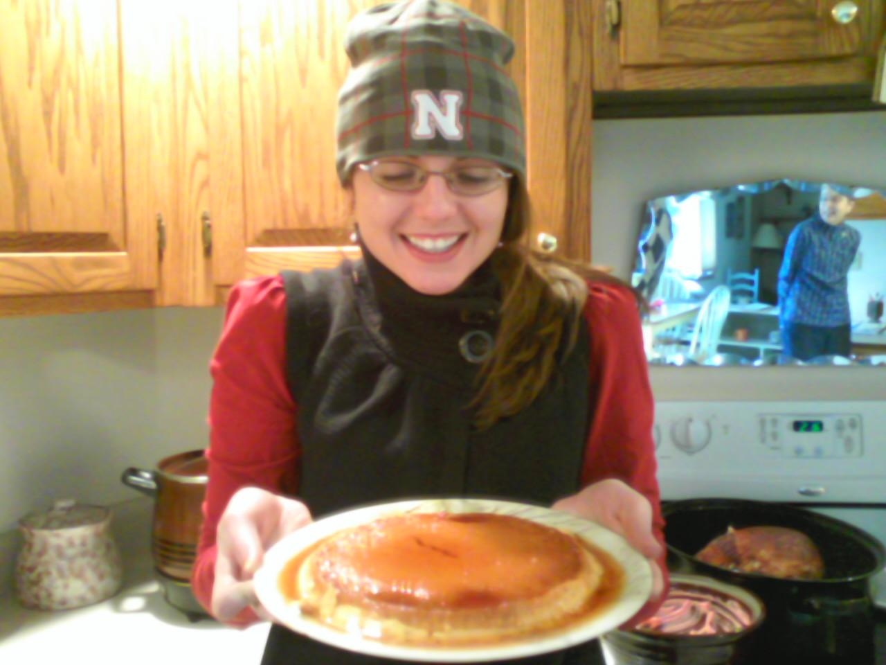 I got this triple-stumper in Edible Rhyme Time: “A nervous, agitated dessert like flan.” This is my lovely sister holding her lovely and scrumptious flan. (Take it from me.)