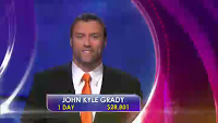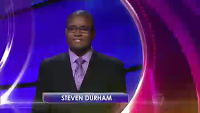 The first clue out of the break (ANCIENT GREEKS $800) was the Daily Double! It was John’s to play. He bet $3,000. His clue: “Life of” this Greek, by the Roman physician Soranus, was published around 100 A.D.. John’s answer of Pericles dropped him down to Steven’s score. The rest of the round was pretty even between John and Steven; the scores at the end of round signal (with the bottom two clues in OF CLAY unplayed) were: