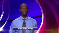 Jermaine finally broke Rhea’s big run, one clue before finding the Daily Double (FRANKLY, MY DEAR $2000). Scores were:
