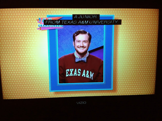 Remember I know the books of the Old Testament by heart? This one was a breeze, but Whitney missed it, giving the fifth book! The next clue was a triple-stumper (see below), and then came the first break. At the end of the round: