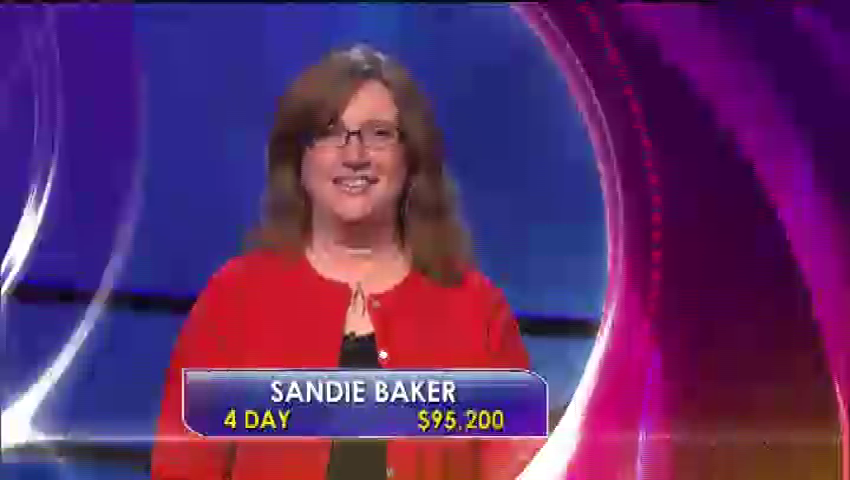 Sandie also got to play the final Daily Double, on the game’s penultimate clue, LIFE $1200. The $1600 clue was left on the board. Scores: