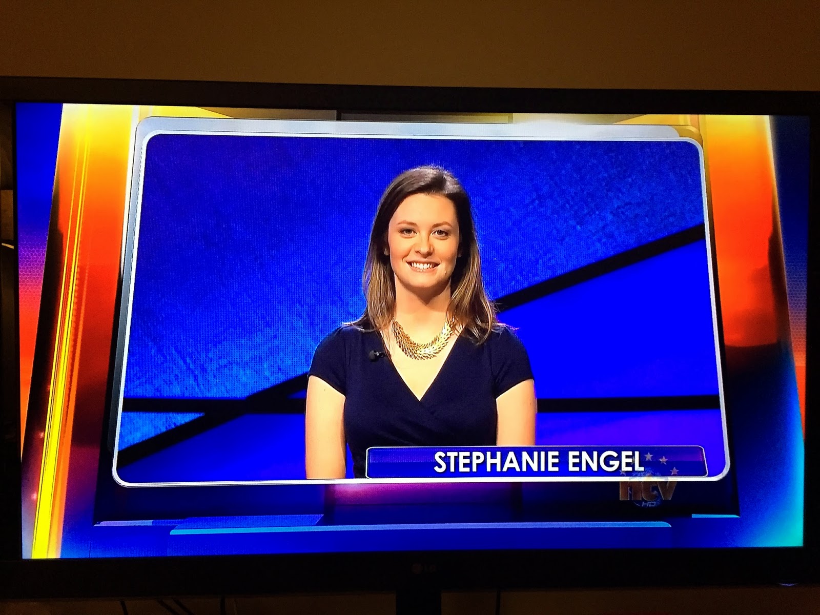 Stephanie bet $1,000. Her clue: Sir Purr, who vacations at Kitty Hawk. Her correct response puts her at $1,600!