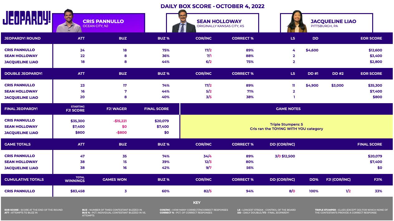 Looking to find out who won Jeopardy! today? Here’s the Tuesday, October 4, 2022 Jeopardy! by the numbers:
