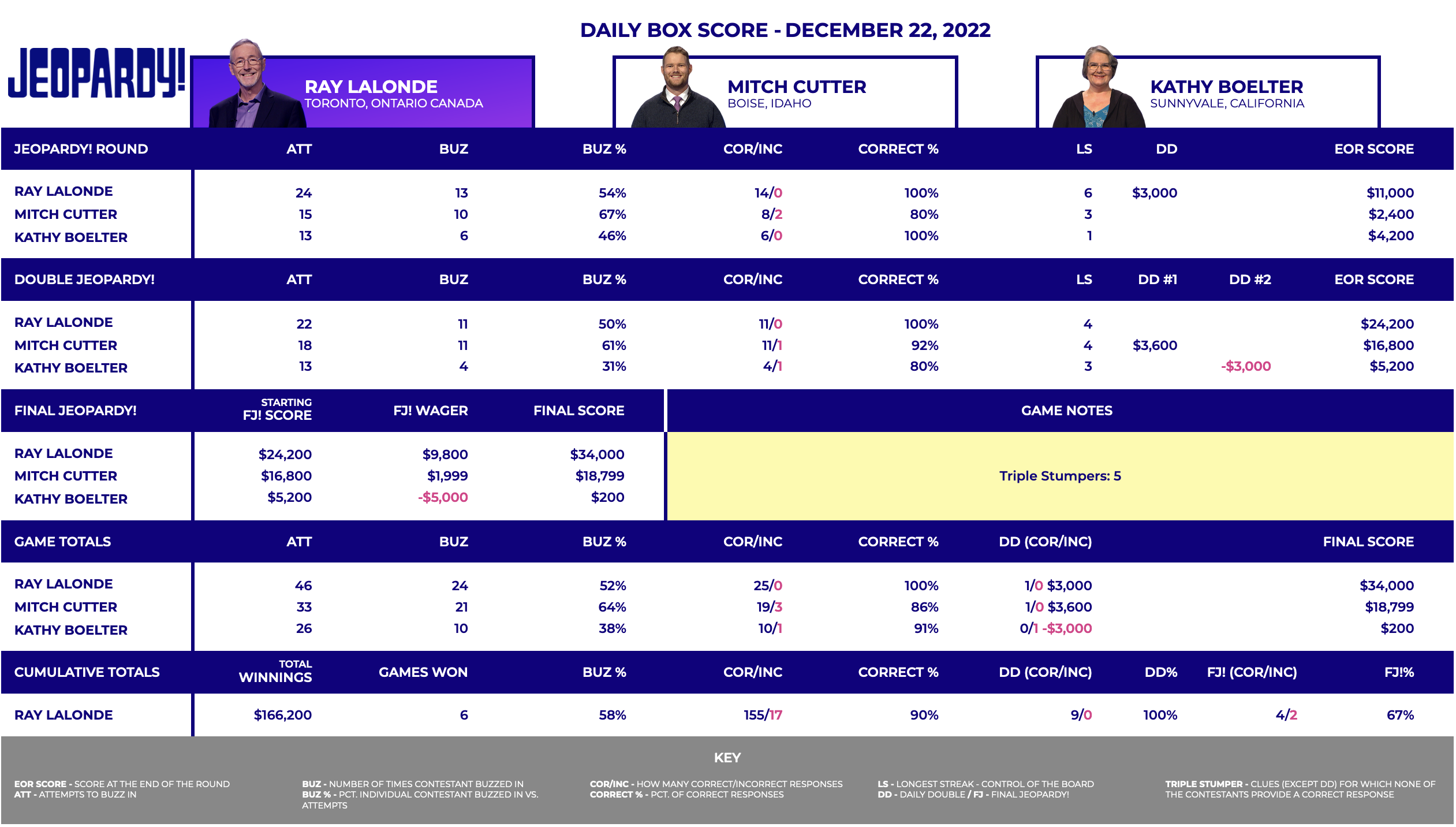 Warning: This page contains spoilers for the December 22, 2022, game of Jeopardy! — please do not scroll down if you wish to avoid being spoiled. Please note that the game airs as early as noon Eastern in some U.S. television markets.