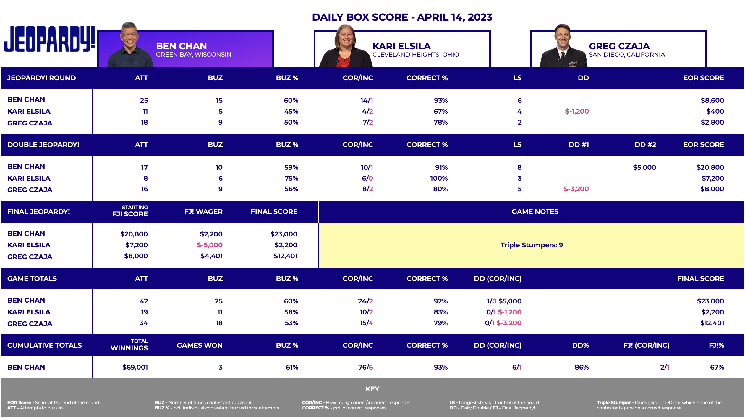 Warning: This page contains spoilers for the April 14, 2023, game of Jeopardy! — please do not scroll down if you wish to avoid being spoiled. Please note that the game airs as early as noon Eastern in some U.S. television markets.