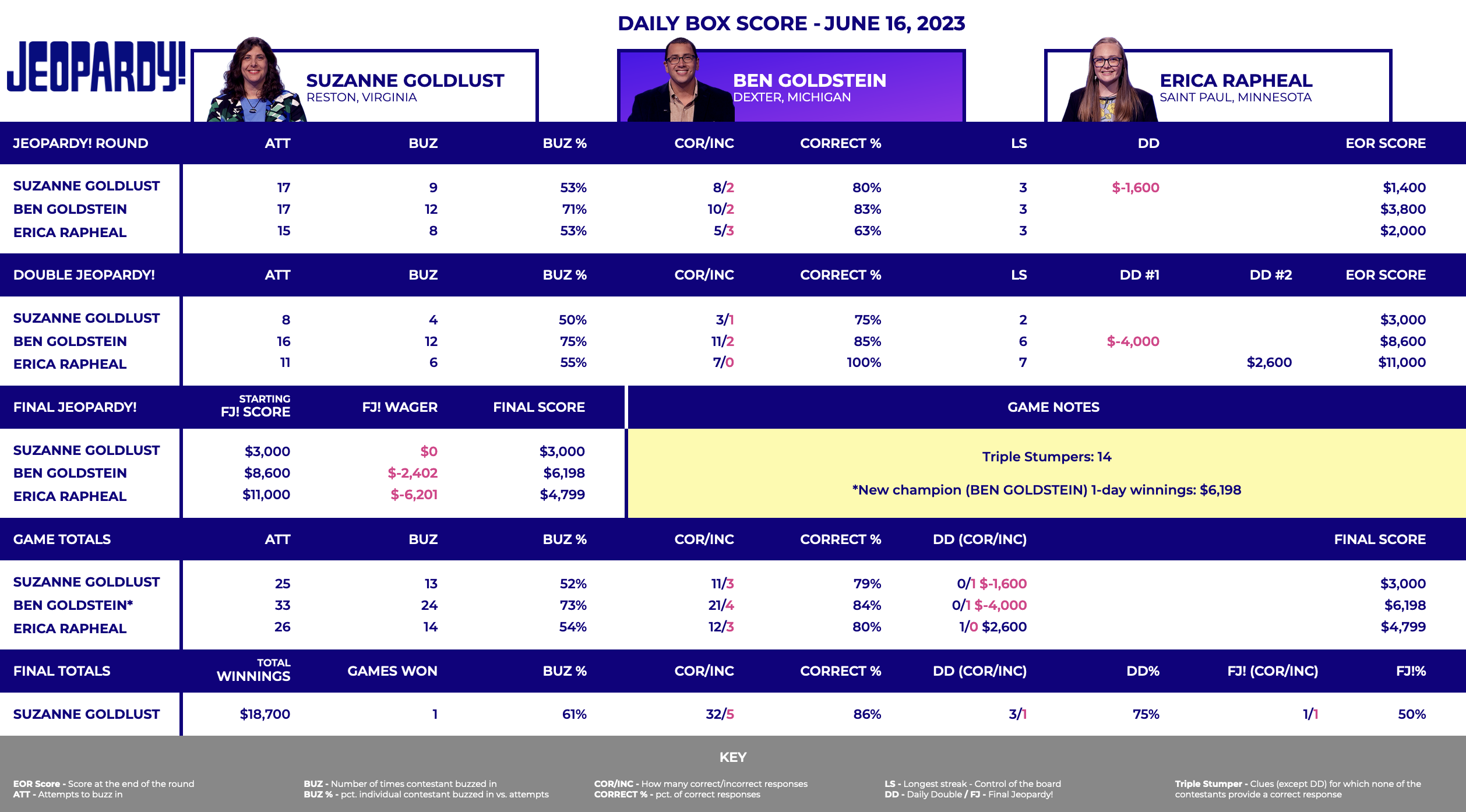 Warning: This page contains spoilers for the June 16, 2023, game of Jeopardy! — please do not scroll down if you wish to avoid being spoiled. Please note that the game airs as early as noon Eastern in some U.S. television markets.