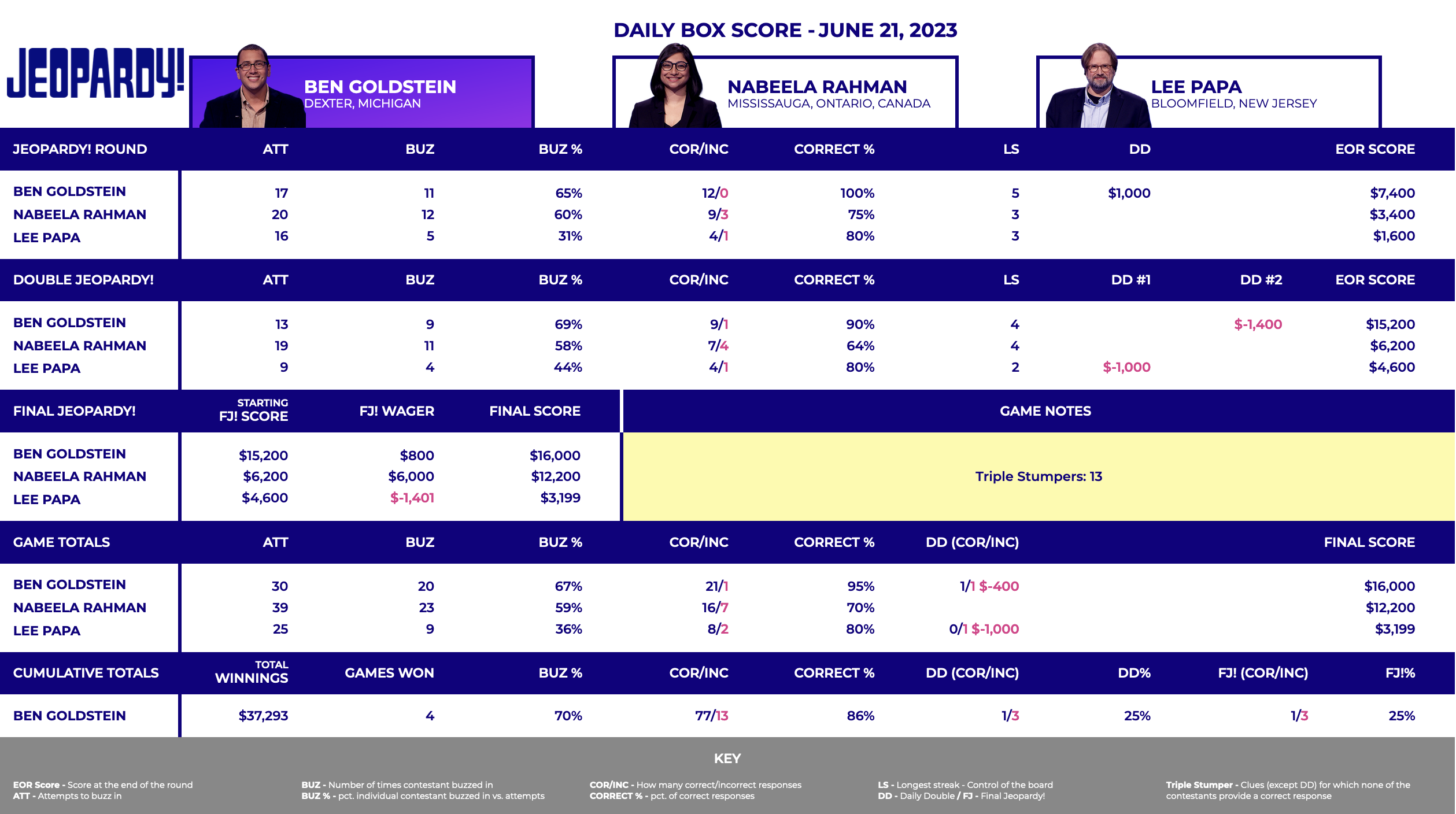 Warning: This page contains spoilers for the June 21, 2023, game of Jeopardy! — please do not scroll down if you wish to avoid being spoiled. Please note that the game airs as early as noon Eastern in some U.S. television markets.