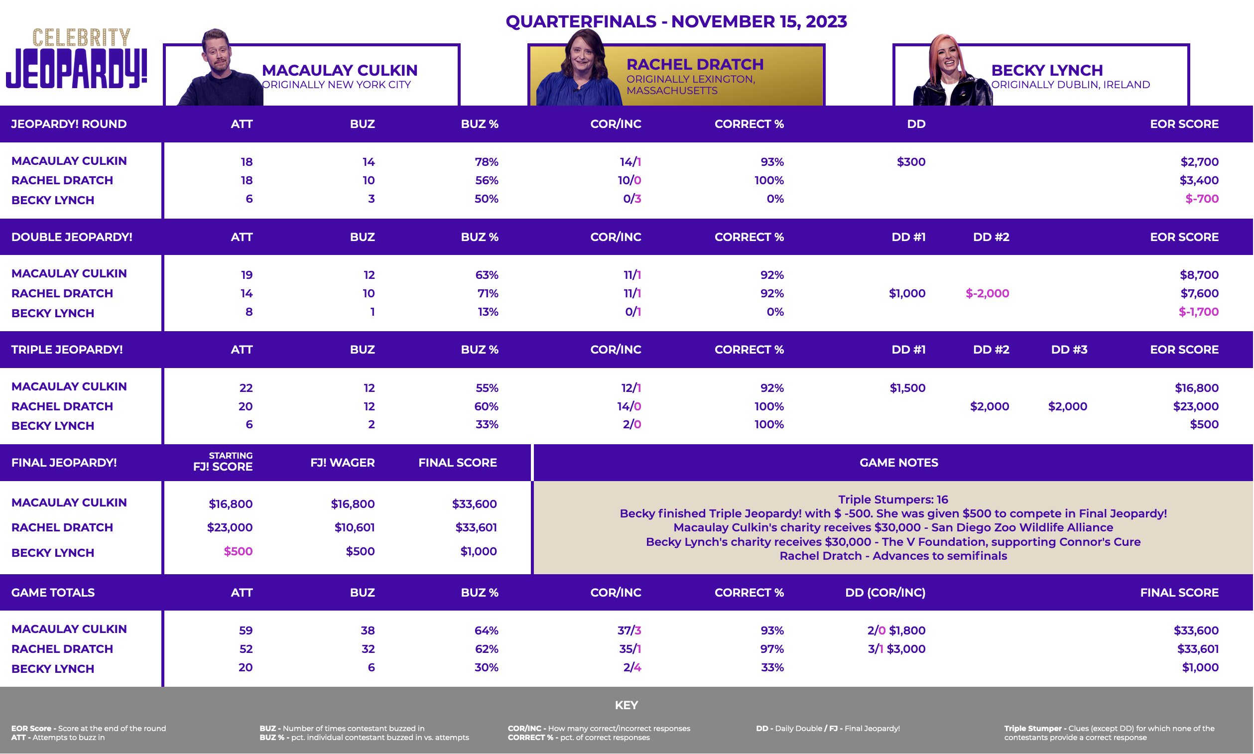 - Today’s box score: November 15, 2023 Celebrity Jeopardy Box Score.