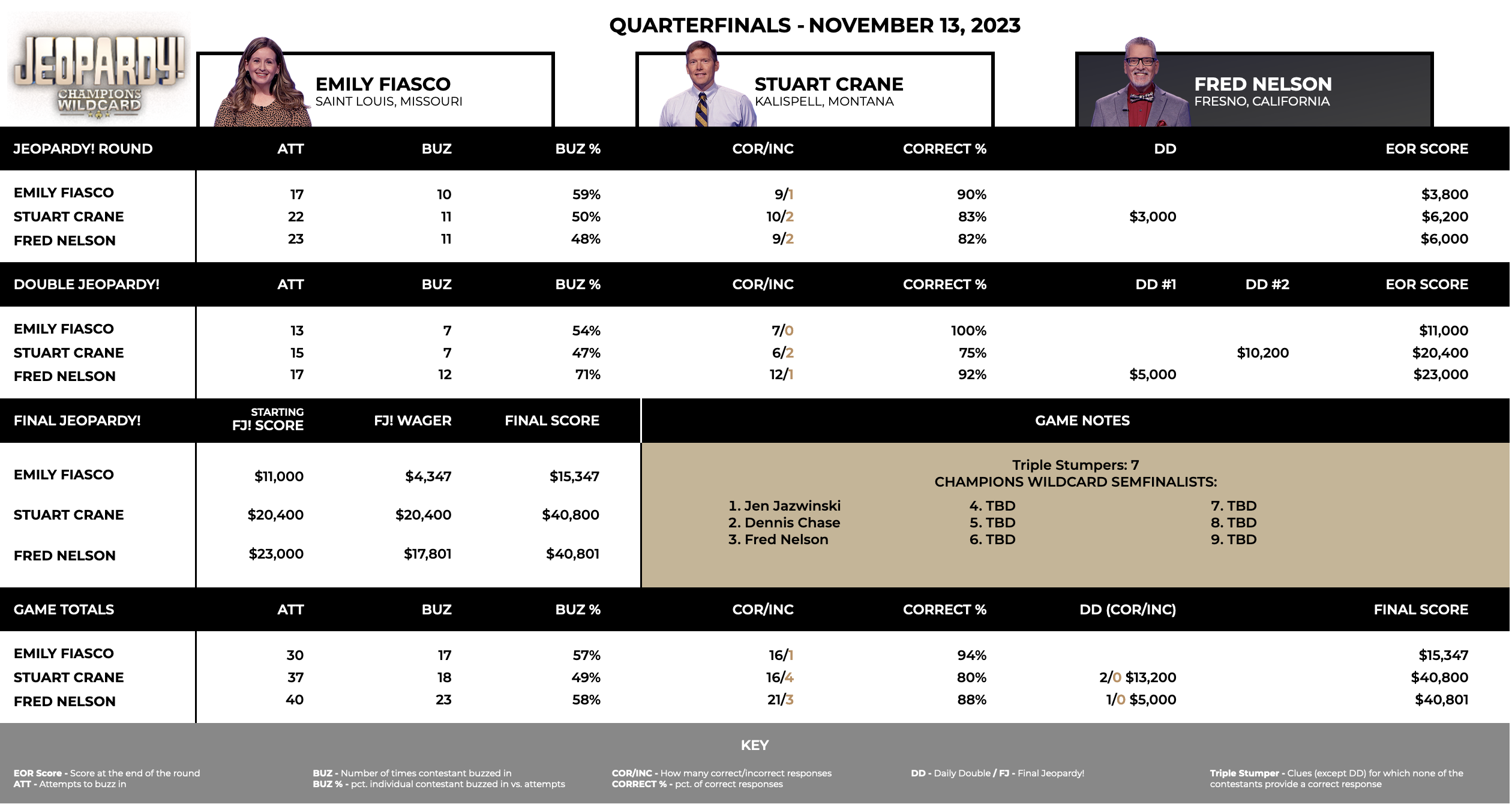 Warning: This page contains spoilers for the November 13, 2023, game of Jeopardy! — please do not scroll down if you wish to avoid being spoiled. Please note that the game airs as early as noon Eastern in some U.S. television markets.