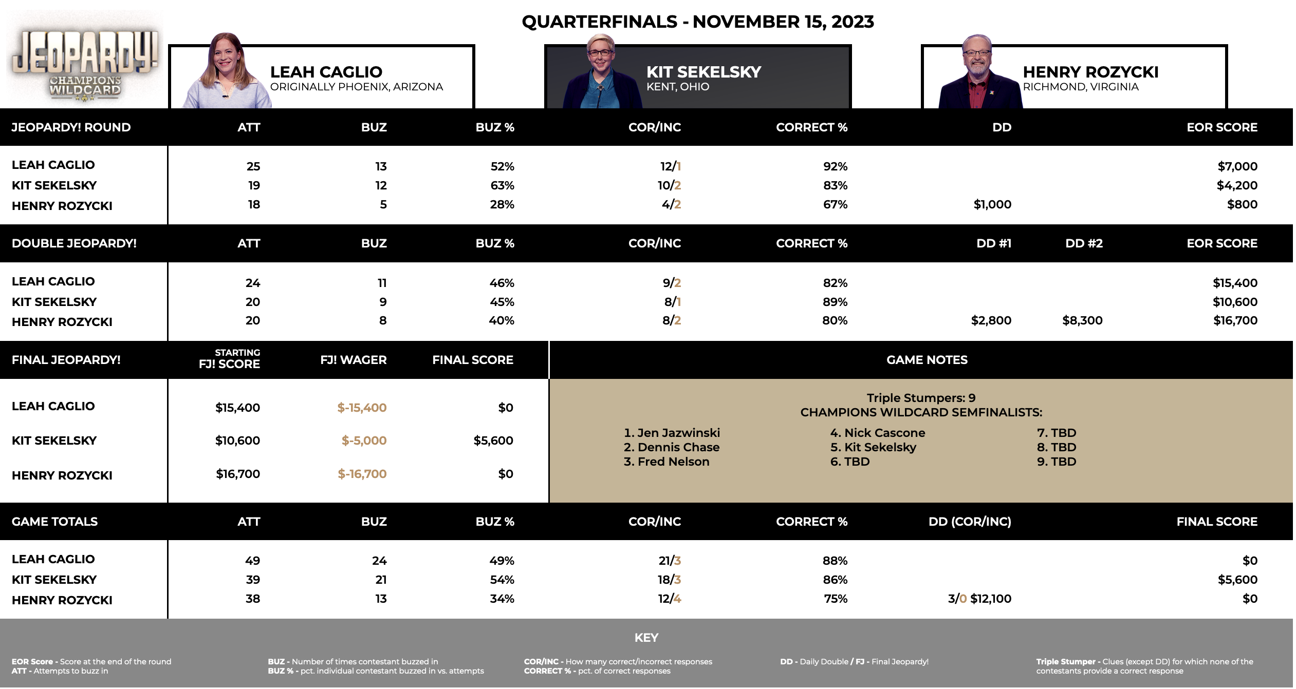 As I said in my preview, Jeopardy! paired three of my favorite champions from Seasons 37 & 38—Leah Caglio, Kit Sekelsky, and Henry Rozycki—in the same quarterfinal. At least with the strike having ended, and these episodes taped with the writers back on-set, I am happy to cheer for all three of these players and will be happy regardless of today’s outcome!