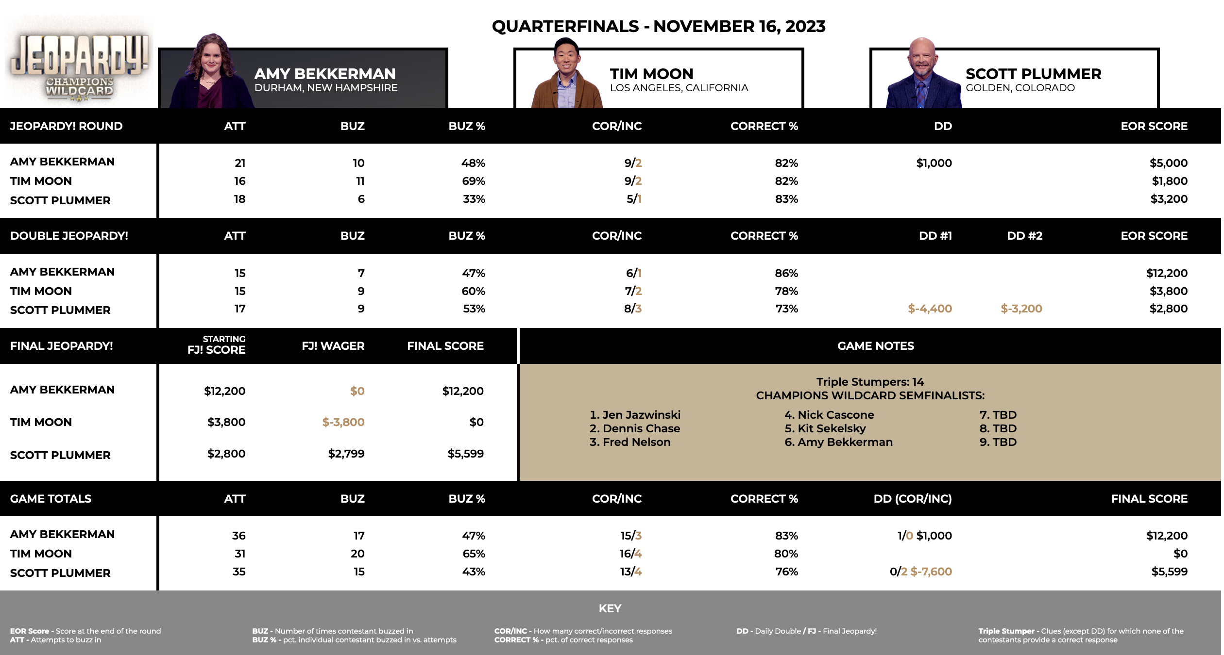 As I said in my preview last week, “Tim was one of the rare players to win over $70,000 in their first two wins and not qualify for the Tournament of Champions”. If his gameplay has stayed at the same level, he has to be considered the favorite in this one. However, I did also note that in his initial games, he played too conservatively from the lead, only playing more aggressively when he was behind. That could be bad news for him if he gets a good start in this one. Amy was known for aggressive Daily Double betting in her initial run, while Scott’s one victory from February 2022 came after a late-game charge from Zoha Khalili that was very reminiscent of how things went in yesterday’s quarterfinal for Henry Rozycki. (I’m still shocked that Zoha wasn’t part of Second Chance last fall.)